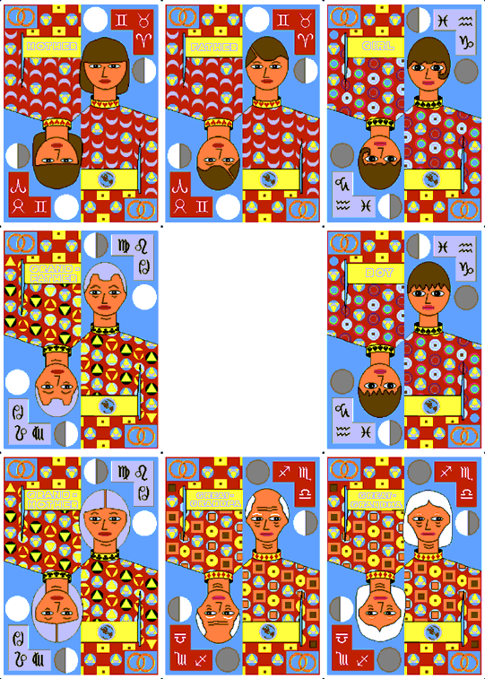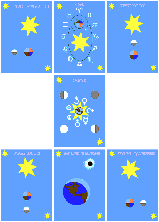 "Twelve Moon cycles through the stars as the Sun makes only one. Twenty-eight times the Sun will burn to mark the place the Moon returns. For a good part of a week day and night the New Moon hides, for the sunshine is lighting the moon's other side. Full Moon rises as the Sun goes down. Full Moon sets as the Sun comes back around. First Quarter Moon rises after noon. After midnight rises the Third Quarter Moon. Stick around for fifty-four years to see the black Sun when it reapppears." ****************************** *Deck of 36