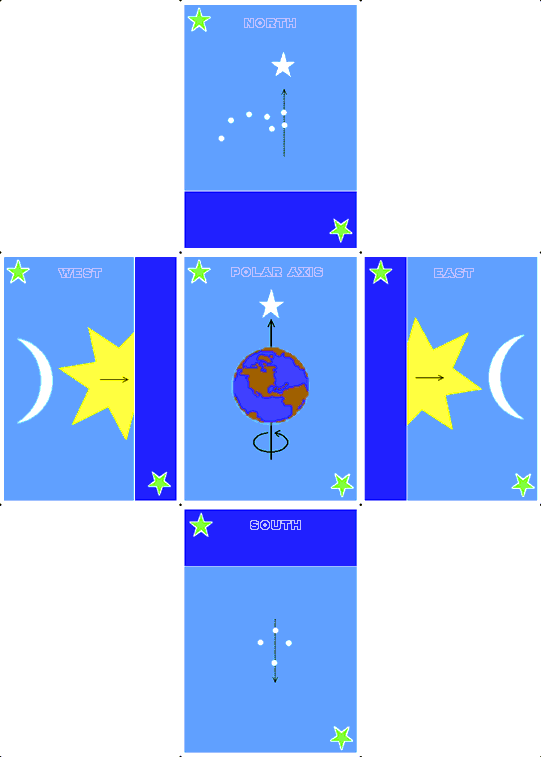 "Face Polaris day or night, west is left east is right. The first Moon to view, as it waxes bright, is a crescent Moon setting as day becomes night. The last Moon to view before it wanes away is a crescent Moon rising as night becomes day. Out at night, the stars shining bright, the Dipper points north to one steady star. Turn about, the Cross points south. How many, why, who, what, when, where?"